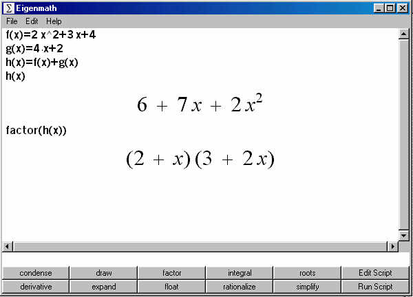 Eigenmath's strength lies in its symbolic manipulation of algebra and calculus. Follow the instructions below to get an overview of these functions. Type the following in the command line and then press the "Enter" key on your keyboard.