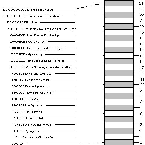 - Now, starting with 20 000 000 000 B.C.E. at the top of the page, draw lines to connect each milestone to where it occurred on the timeline of the last 24 hours. (I have done this for 20 000 000 000 BCE and 2 000 AD.)